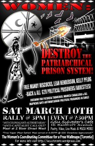 However, despite the harassment and persecution, much resistance has risen from the depth of this brutality. It is for this reason why today we stand in solidarity with our indigenous sisters and brothers who struggle against the ongoing capitalist encroachment for possession of their territory – who struggle to maintain their very existence as a people – and have had to pay the heavy price of political prison and even death at the hands of the genocidal State. It is also for this reason why today we stand with our sisters locally, currently in prison at Vanier Correctional Centre for Women in Milton, ON or facing ongoing charges for having dared to stand up against the economic powers of the world, reflected at the Toronto G20 Summit of June 2010. Our sisters proved that they will not be objectified, nor will they be restricted by the determination of a society based on private property and commodification.