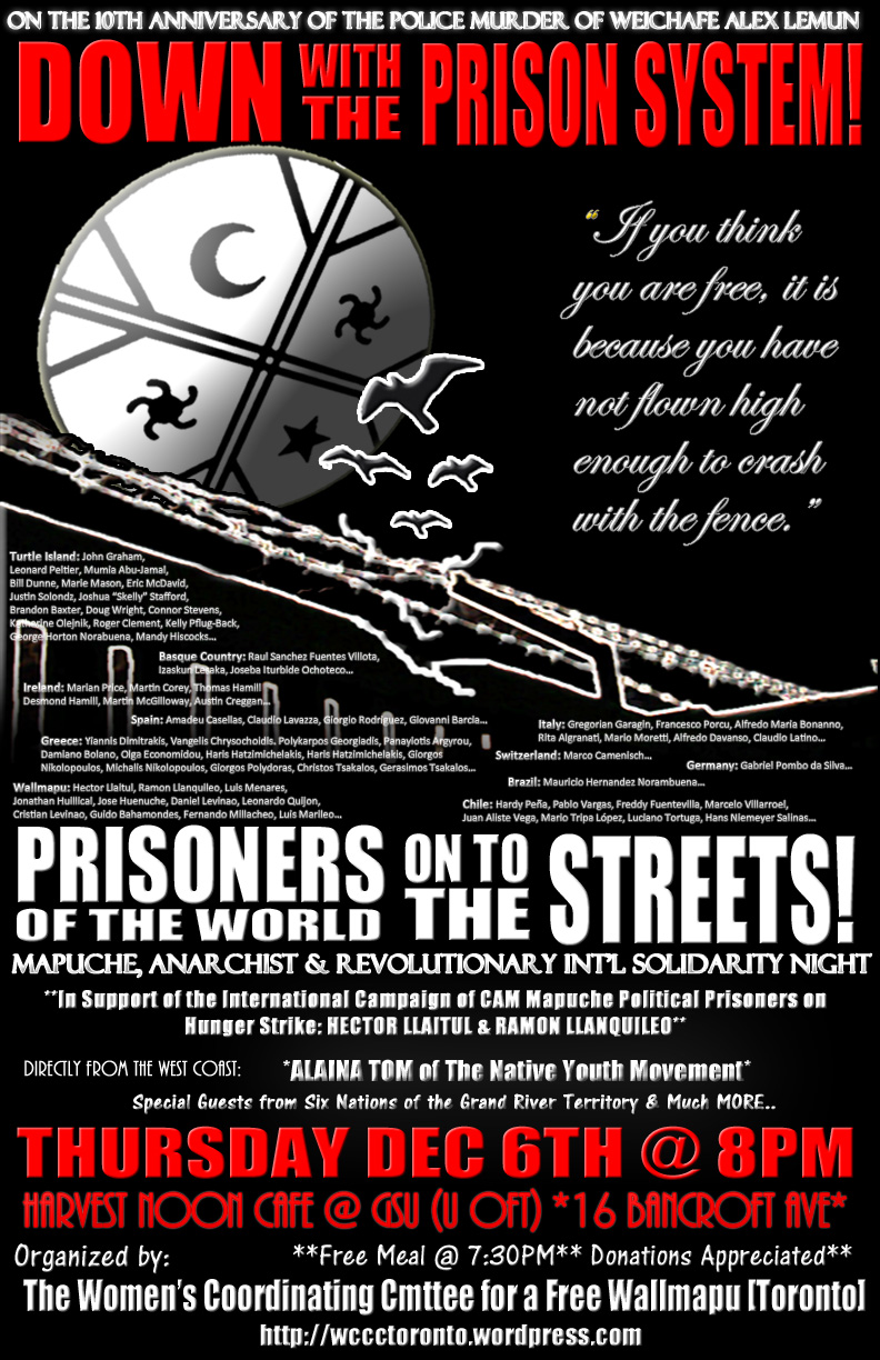 10 years after the cruel police murder of our young Weichafe Alex Lemun and in the hypocritical framework of International Human Rights Day, we call out in solidarity to support the Arauco Malleco Coordinator of Communities in Conflict (CAM) Mapuche Political Prisoners and Leonardo Quijon of the Mapuche Community of Chequenco, all currently on Hunger Strike; as well as extend our solidarity to the Political Prisoners of the World sequestered by State Capital and their governments in turn.