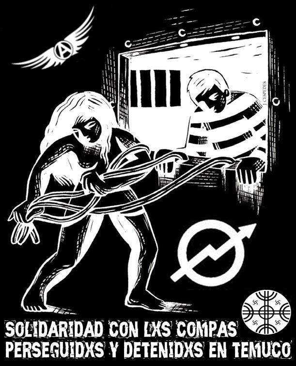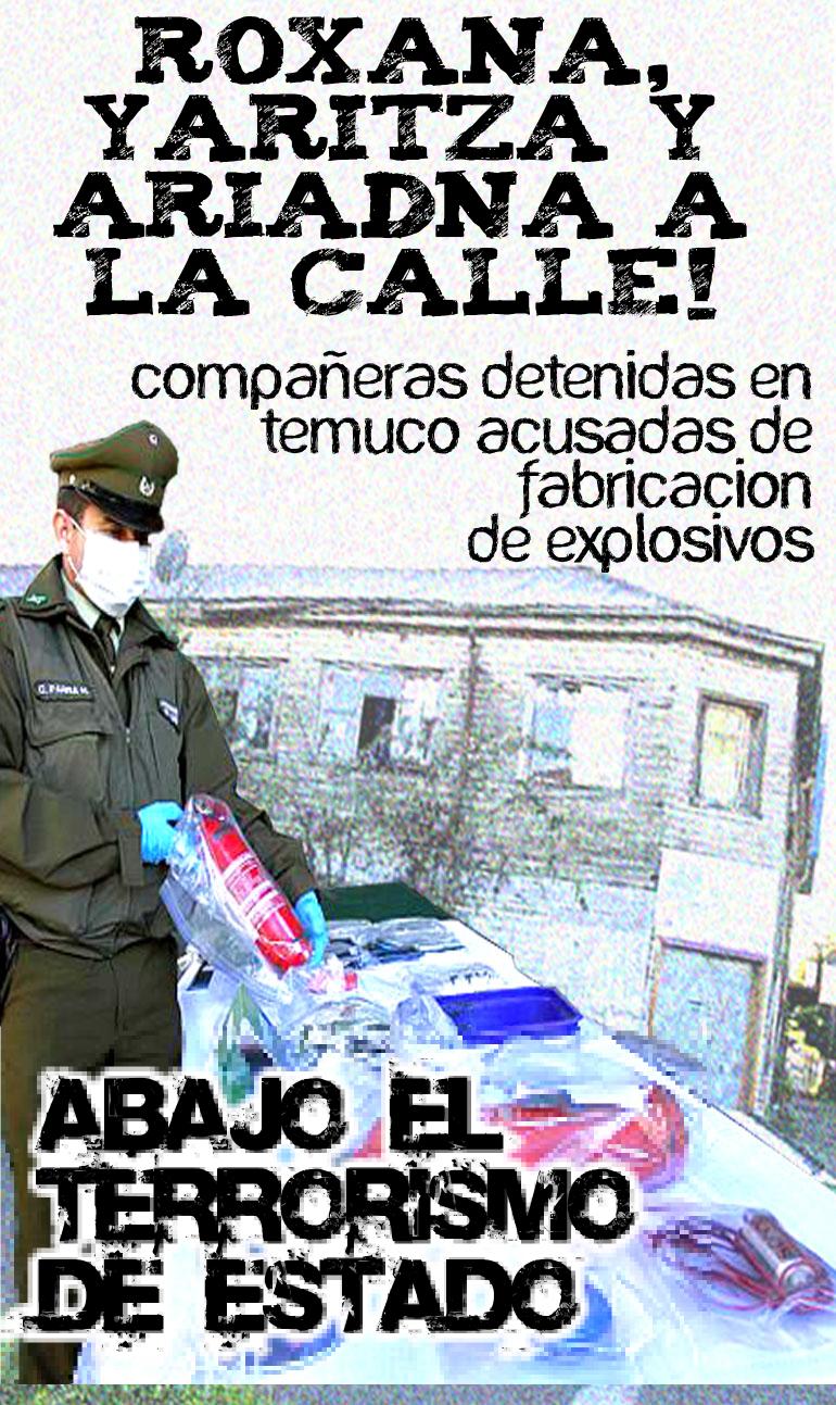 Three women were left in pre-trial custody for 5 months in Temuco today, under investigation for the preparation and transportation of explosive materials. Two men were charged and processed for possession of 100 grams of marihuana and will be held in preventive custody for at least 3 months. Another 6 comrades have been released and will have to pay a fine of 2 UTM (approx. $250 USD) refusing to identify themselves.