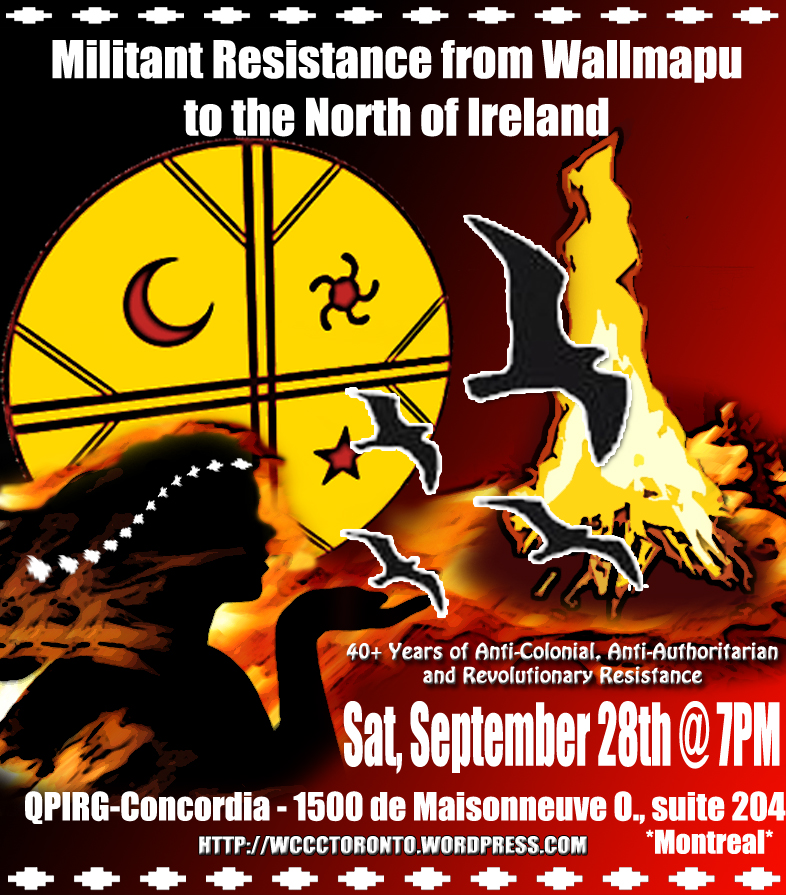 The Women’s Coordinating Committee for a Free Wallmapu, will speak on the significance of the last 40 years of revolutionary and anti-colonial struggle in Wallmapu (Mapuche territory), Chile, and beyond the Andes. This September 11th marks the 40th anniversary of the Coup d’état in Chile and with it the memory of a brutal dictatorship, the commemoration of the many thousands of missing, murdered and exiled victims by the Chilean State, with the implementation of the Shock Doctrine known as the neoliberal economic model we live in today. However, the victims of State repression go far beyond the period of the Pinochet dictatorship in Chile. We must also recognize the ongoing plunder and criminalization of the most marginalized sectors of our society by those in power, the later hunt for the revolutionary movements that were born in response to these injustices, and especially the ongoing genocide of indigenous peoples on their ancient territory.The WCCC [Toronto] is an indigenous Mapuche grassroots organization based in Toronto, Turtle Island. Our goal is to link the struggles of indigenous sovereignty (specifically the Mapuche Peoples of so-called southern $hile) with that of other indigenous, anti-capitalist/anti-colonial, community based struggles across Turtle Island, by creating awareness through events, protests, publications, etc….