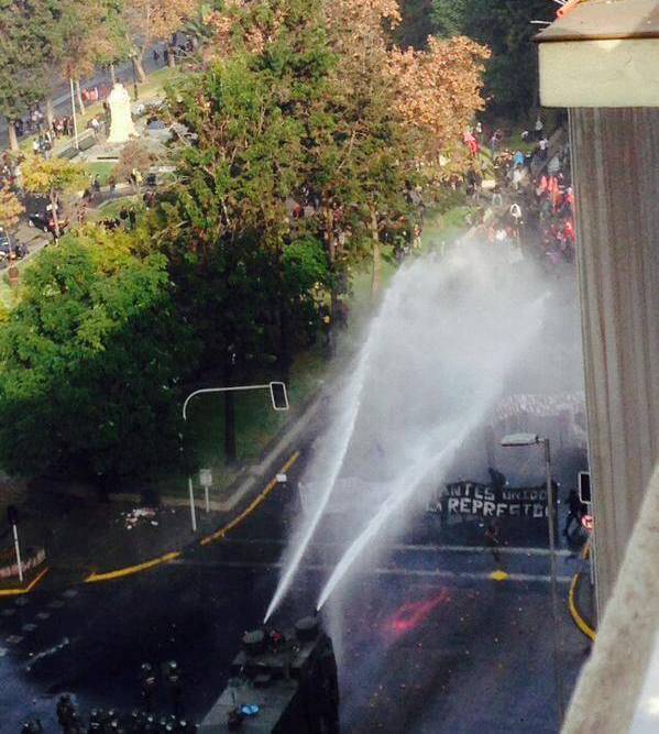 An art student from Catholic University is currently in critical condition after being knocked to the ground and badly injured by a police water cannon during a protest that brought out six thousand students in the port city of Valparaiso last week.