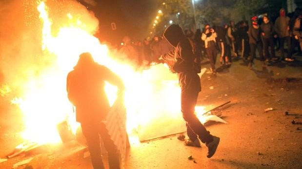 After being dispersed by police, thousands of protesters again took to the streets May 28 night. Hooded protesters gathered around a government building where they erected barricades and attempted to loot shops, police said.